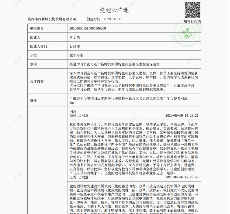 除線下面對面、點對點宣講外,灃西投資在釘釘黨建云平臺、微信群發(fā)起交流討論活動,不斷擴大宣講知識的覆蓋面和感染力,切實做到入腦入心。