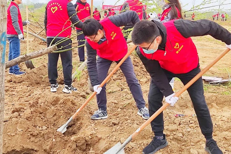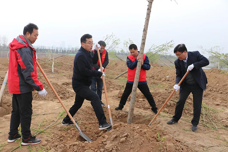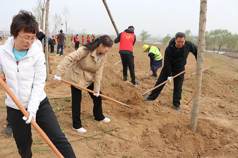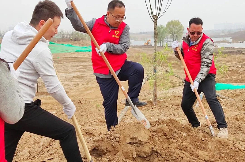大家身著鮮紅的志愿者馬甲,個個精神抖擻、相互協(xié)作,扶樹苗,揮鍬填土,踩土夯苗,澆水,一氣呵成,井然有序,植樹場景成為一道美麗的風(fēng)景線。經(jīng)過全體人員辛勤勞動,“青年林”200余棵旱柳迎風(fēng)挺立,綻放勃勃生機(jī)。