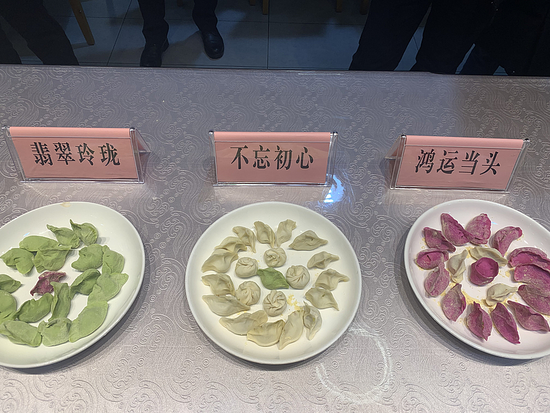 活動首先通過暖場小游戲將參與人員分為三組,根據(jù)菠菜、火龍果等不同顏色、不同口味的面團,設置“鴻運當頭”“不忘初心”“翡翠玲瓏”的組名,餐廳工作人員為大家演示包餃子的正確手法。