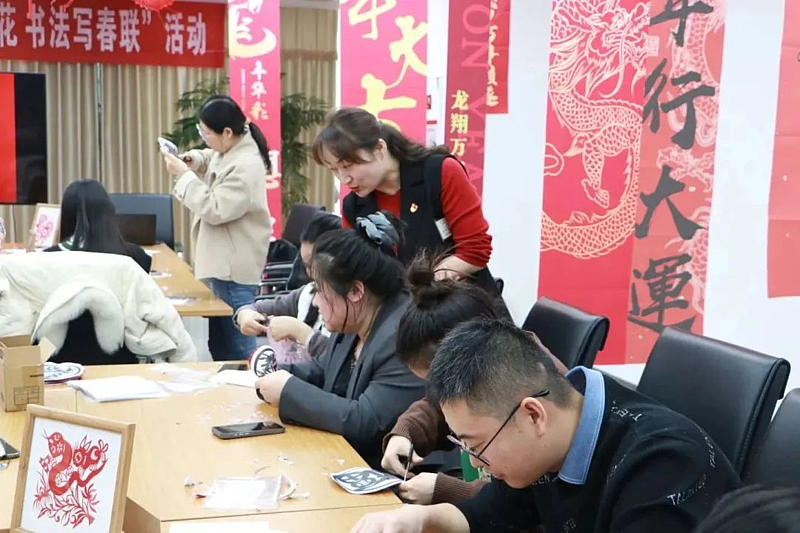 活動(dòng)現(xiàn)場(chǎng),前來寫剪窗花、寫春聯(lián)的職工絡(luò)繹不絕。剪紙老師細(xì)致地為大家講解剪紙技巧,大家歡聚一堂,共同感受剪紙的樂趣,一剪一剪慢慢雕琢著“福”字和生肖“龍”,剪刀一起一落間紅色祝福灑落祥和。書法家鋪開紅卷,挽袖執(zhí)筆,筆走龍蛇,潑墨揮毫。“全家歡樂春來早,老少祥福慶壽高”“百花迎春福滿庭,萬事順意喜臨門”……一副副散發(fā)著清新墨香、飽含濃情與祝福的春聯(lián)躍然紙上,一字一墨賡續(xù)著傳統(tǒng)文化,紅紙黑字間映透著共同的祝福和心愿。活動(dòng)期間,幾輪有關(guān)“龍”文化的有獎(jiǎng)競(jìng)猜活動(dòng)引得現(xiàn)場(chǎng)員工陣陣歡呼,現(xiàn)場(chǎng)呈現(xiàn)一片歡樂、祥和、喜慶的氛圍。
