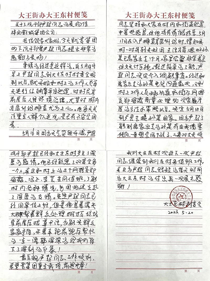 收到大王東村村委會的“表揚信”后,尹超說:“很意外,下沉駐村這項工作,無論是我們哪位同事也一樣能干好。如果說得到群眾的表揚算一份榮譽的話,這份榮譽更應該屬于灃西集團,是組織給了我走實、走心、走進群眾心坎里的機會。”