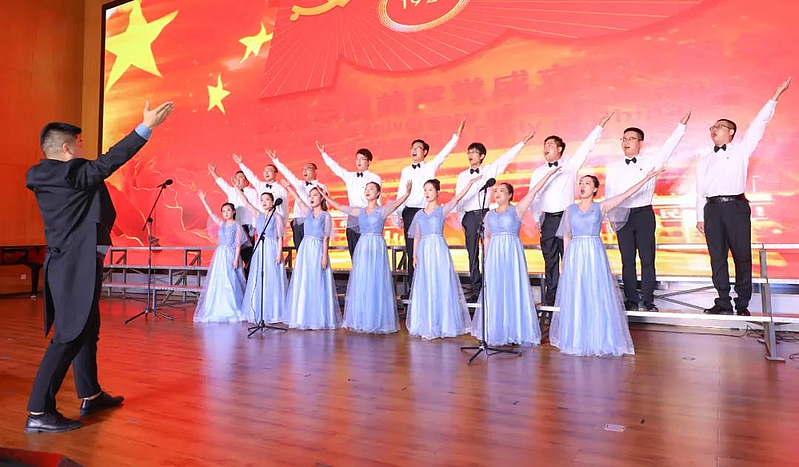 一首紅歌就是一面旗幟?!澳憔碜吆谝褂瓉沓筷?,火紅的心把我們集合在一起,救國救民是你喊出的真理,中國的明天放在了我們心里……”《迎風(fēng)飄揚的旗》《紅旗飄飄》《不忘初心》《陽光路上》等用奔騰奮發(fā)的曲調(diào),展現(xiàn)在中國共產(chǎn)黨的堅強(qiáng)領(lǐng)導(dǎo)下,中華民族實現(xiàn)了從站起來、富起來到強(qiáng)起來的偉大飛躍,表達(dá)出灃西人堅定不移跟黨走,拼搏奮進(jìn)新時代的使命。