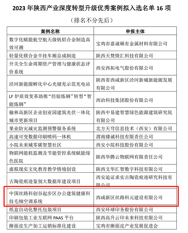 近日,2023年陜西科技創(chuàng)新優(yōu)秀案例征集評(píng)選結(jié)果公布,西咸新區(qū)絲路科元建設(shè)有限公司申報(bào)的“秦創(chuàng)原生態(tài)科創(chuàng)島(中國(guó)絲路科創(chuàng)谷起步區(qū))辦公建筑健康科技毛細(xì)空調(diào)系統(tǒng)”成功入選。