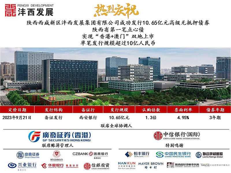 9月21日,陜西西咸新區灃西發展集團有限公司(以下簡稱“灃西發展”)成功定價發行10.65億元高級無抵押離岸人民幣債券,系陜西省首單點心債券,西部首筆“香港+澳門”雙掛牌點心債券,本次外債額度全額一次發行,將開啟灃西離岸融資新歷程!繼2023年5月成功發行15億元公司債券以來,灃西發展持續發力金融賽道,搶抓政策機遇,亮相國際市場,本次點心...