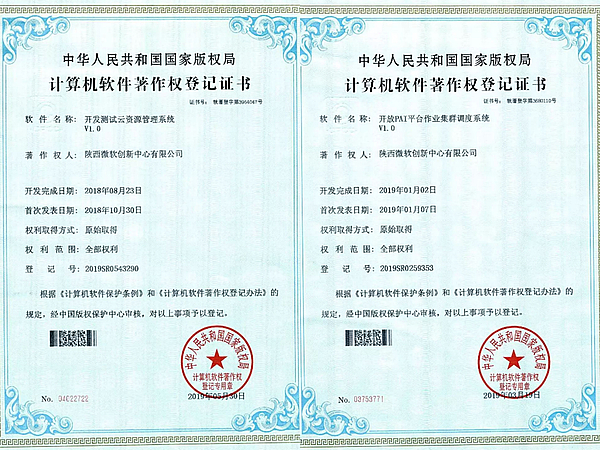 近日,由陜西微軟創新中心主導設計開發的開發測試云資源管理系統、開放PAI平臺作業集群調度系統順利通過國家版權局審查,喜獲國家計算機軟件著作權證書。
